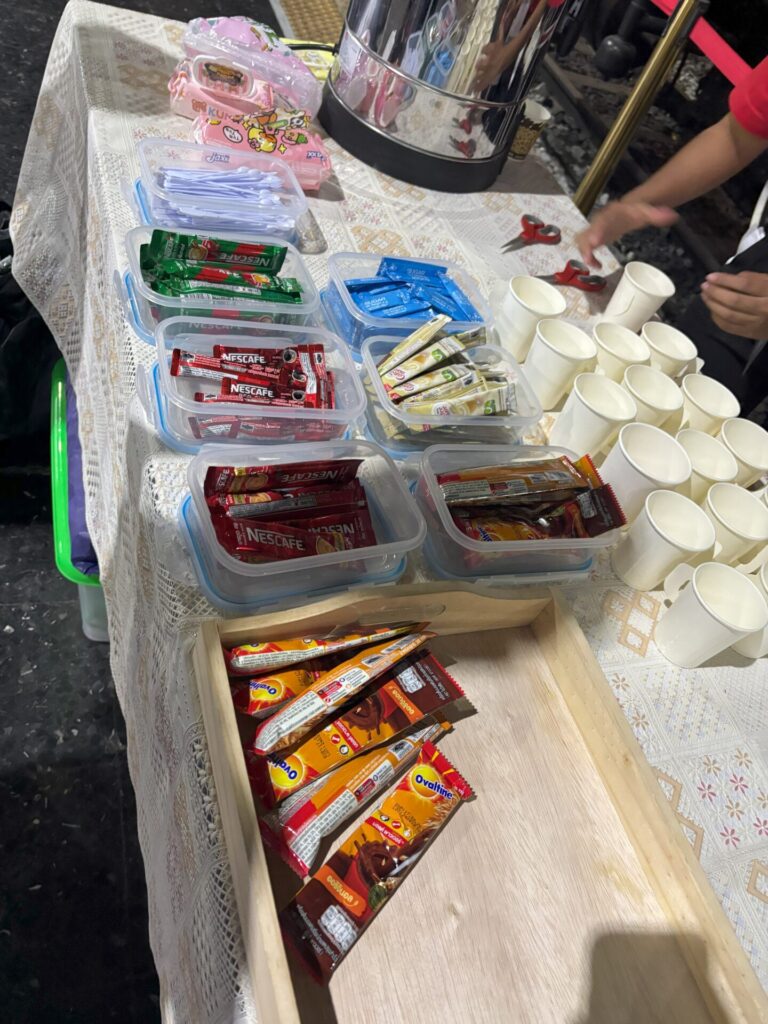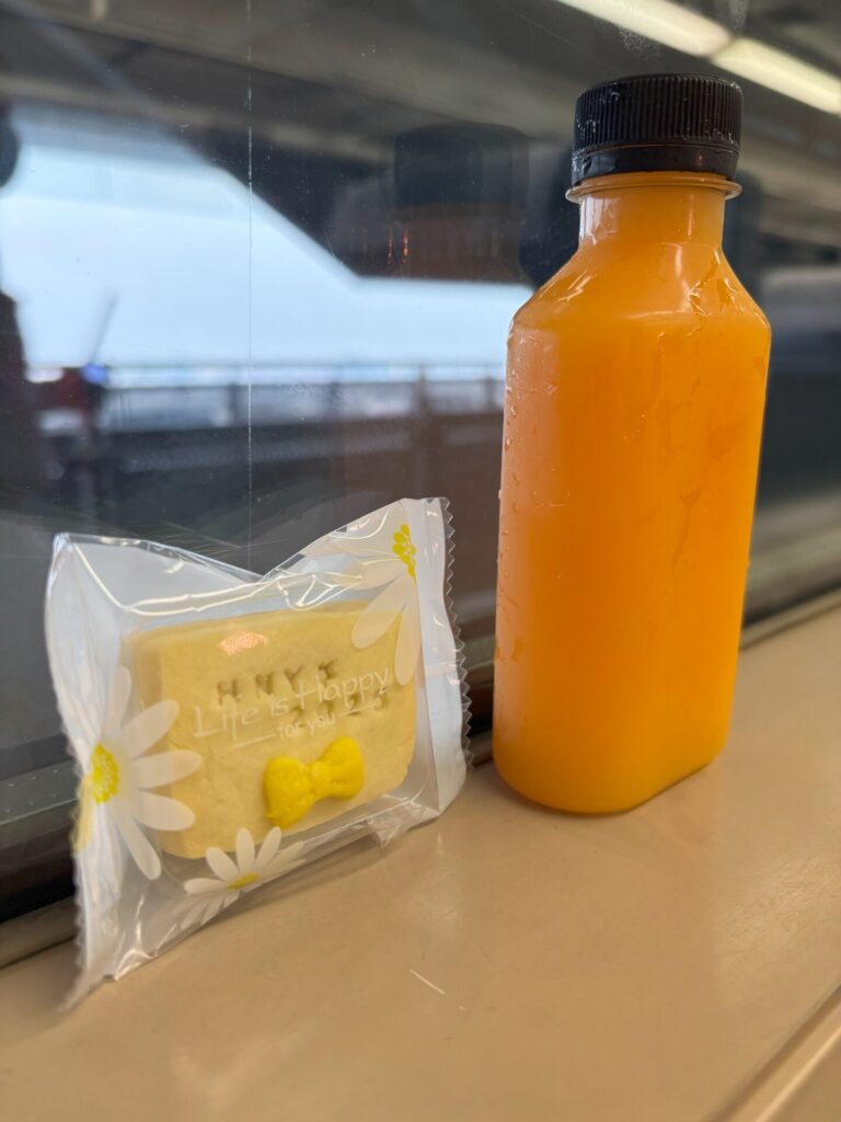 受付を済ませ乗車するため列車に向かう道中、まず目に入るのがドリンクデスク。ここでは無料でホットドリンク(コーヒーやホットココア)が提供されています。スティックとお湯はスタッフが入れてくれるので、自分でかき混ぜていただきます。朝の出発には嬉しいサービスです!