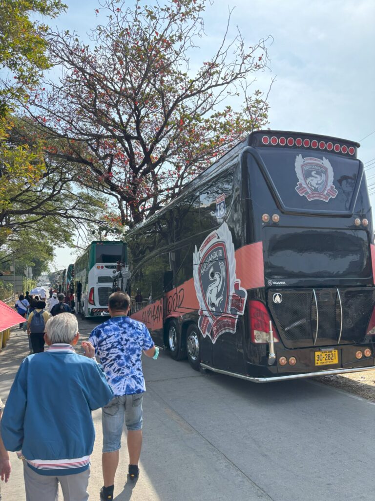 再び列車に乗り、午前10時20分頃にMuak Lek駅に到着。ここでバスに乗り換え、いくつかの観光地を回ります。二階建てバスに乗車。どのバスに乗るかはツアータグで判別されます。座席は自由です。このバスではUSB充電口があり、携帯の充電ができました。