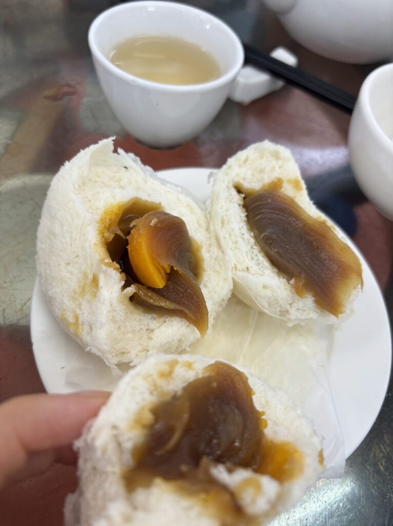 まずは蒸しパン。甘い餡に黄身が入っていました。